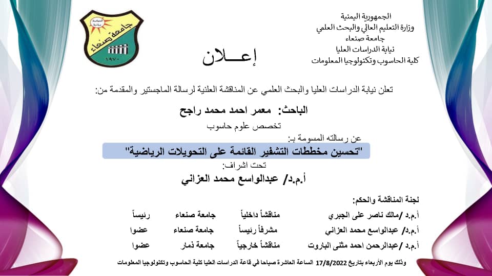 أطروحة مقدمة لقسم علوم الحاسوب، كلية الحاسوب وتكنولوجيا المعلومات بجامعة صنعاء كجزء من متطلبات نيل درجة ماجستير العلوم في علوم الحاسوب.