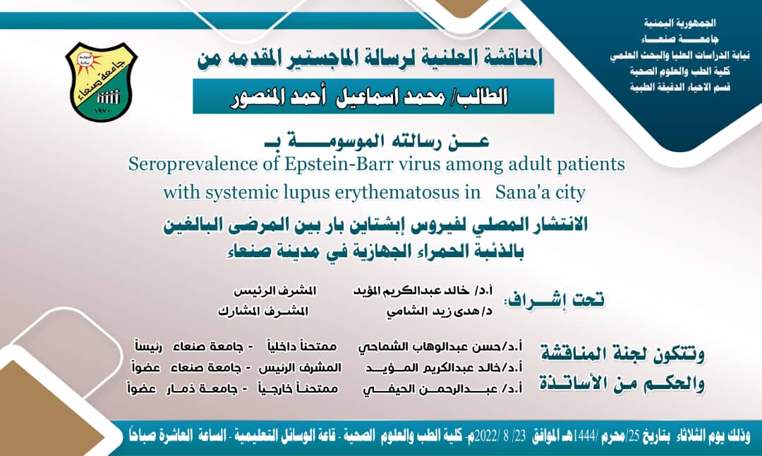 الإنتشار المصلي لفيروس إبشتاين بار بين المرضى البالغين بالذئبة الحمراء الجهازية في مدينة صنعاء .