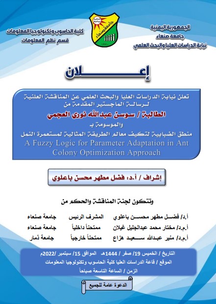 تعلن نيابة الدراسات العليا والبحث العلمي عن المناقشة العلنية لرسالة الماجستير المقدمة من :