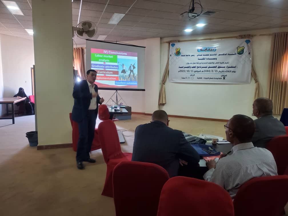 وفي الورشة التي حضرها نائب رئيس الجامعة لشئون الكليات الطبية الدكتور عبداللطيف ابو طالب والدكتور خالد الخميسي عميد كلية الطب البشري اكد رئيس الجامعة الدكتور القاسم عباس على اهمية الاستفادة من التوصيف الذي تم لبرنامج الطب والجراحة للبناء عليه واعتبار الورشة تمهيدية لدائرة اوسع من التواصل لكل الجهات ذات العلاقة.