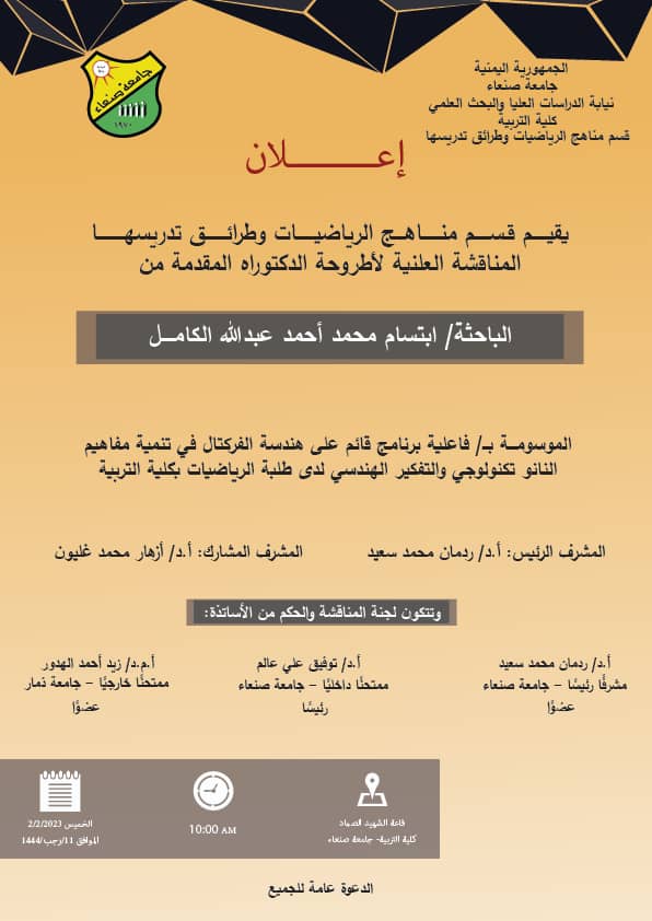 تعلن نيابة الدراسات العليا والبحث العلمي عن المناقشة العلنية لرسالة الدكتوراه المقدمة من :