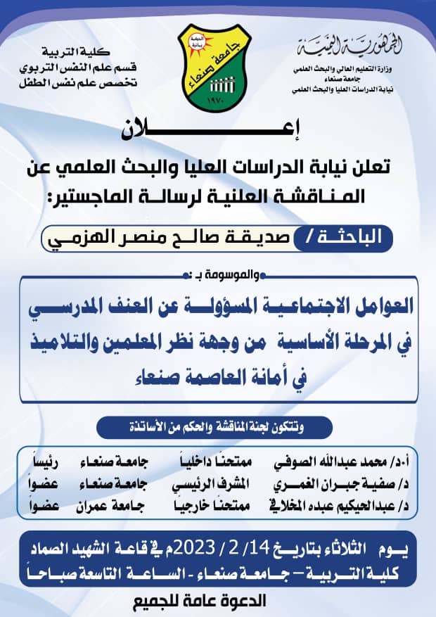 العوامل الاجتماعية المسؤولة عن العنف المدرسي في المرحلة الأساسية من وجهة نظر المعلمين والتلاميذ في أمانة العاصمة- صنعاء