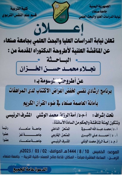 تعلن نيابة الدراسات العليا والبحث العلمي عن المناقشة العلنية لرسالة الدكتوراه المقدمة من :
