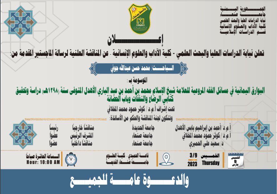 تعلن نيابة الدراسات العليا والبحث العلمي عن المناقشة العلنية لرسالة الماجستير المقدمة من :