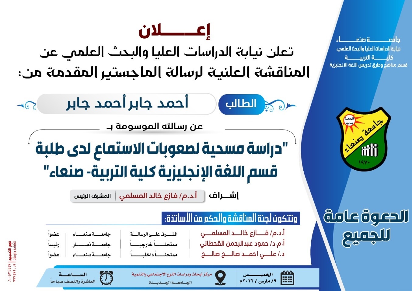 دراسة مسحية لصعوبات الاستماع لدى طلبة قسم اللغة الإنجليزية كلية التربية-صنعاء