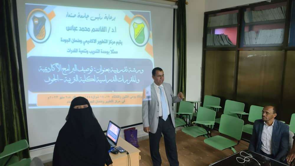 برعاية رئيس جامعة صنعاء الاستاذ الدكتور القاسم محمد عباس أقام مركز التطوير الاكاديمي وضمان الجودة( وحدة التدريب) بالجامعة ورشة حول( توصيف البرامج الأكاديمية والمقررات الدراسية بكلية التربية – الجوف).