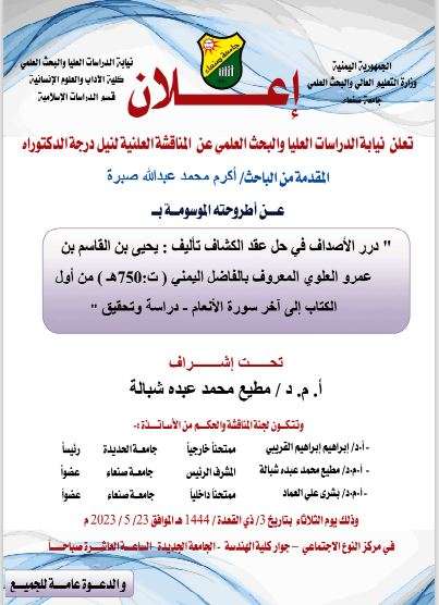 تعلن نيابة الدراسات العليا والبحث العلمي عن المناقشة العلنية لرسالة الدكتوراه المقدمة من :
