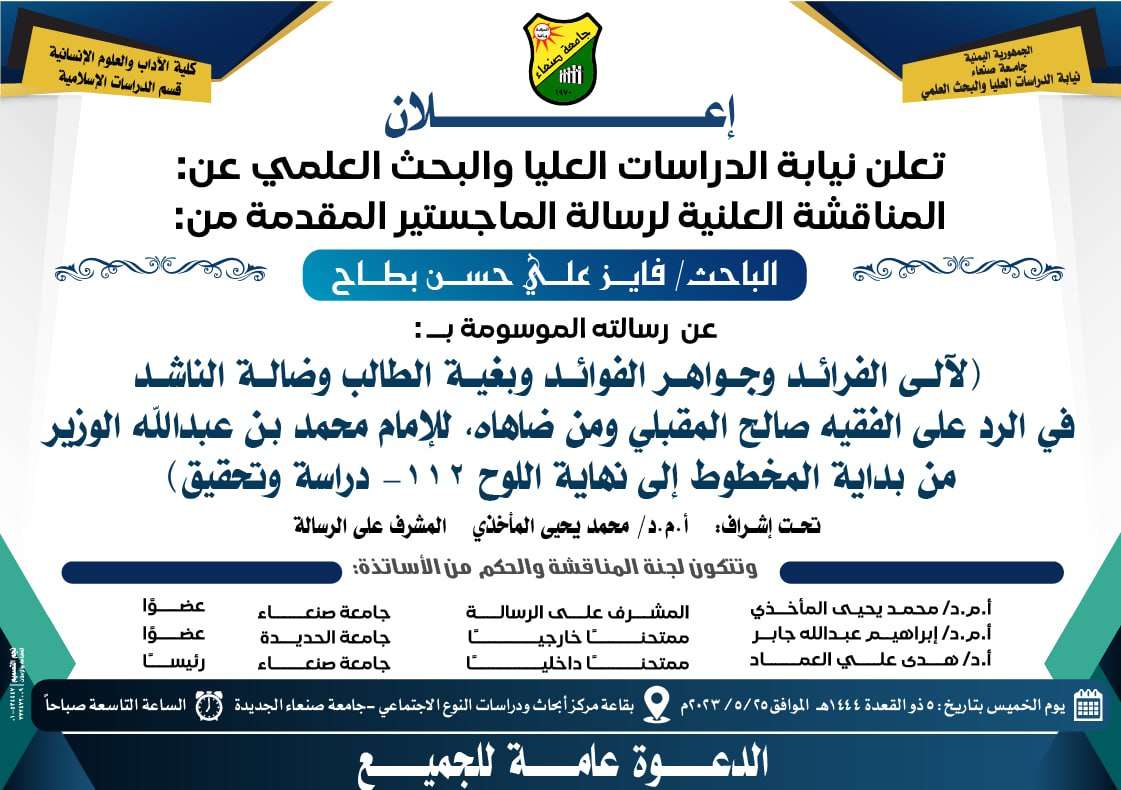 لآلئ الفرائد وجواهر الفوائد وبغية الطالب وضالة الناشد في الرد على الفقية صالح المقبلي ومن ضاهاه، للامام محمد بن عبدالله الوزير من بداية المخطوط الى نهاية اللوح 122-دراسة وتحقيق