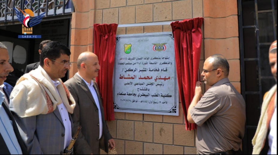 كما افتتح الرئيس المشاط كلية الطب البيطري بقيمة 423 ألف دولار، واستمع من عميد الكلية الدكتور عبدالرؤوف الشوكاني إلى شرح عن مراحل إنشاء الكلية والتجهيزات الحديثة وأعمال التأثيث المختلفة.