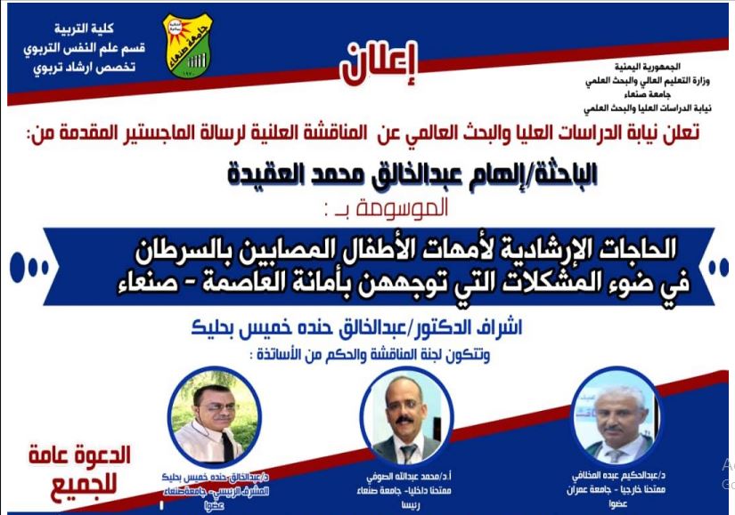 الحاجات الإرشادية لأمهات الأطفال المصابين بالسرطان في ضوء المشكلات التي توجههن بأمانة العاصمة –صنعاء