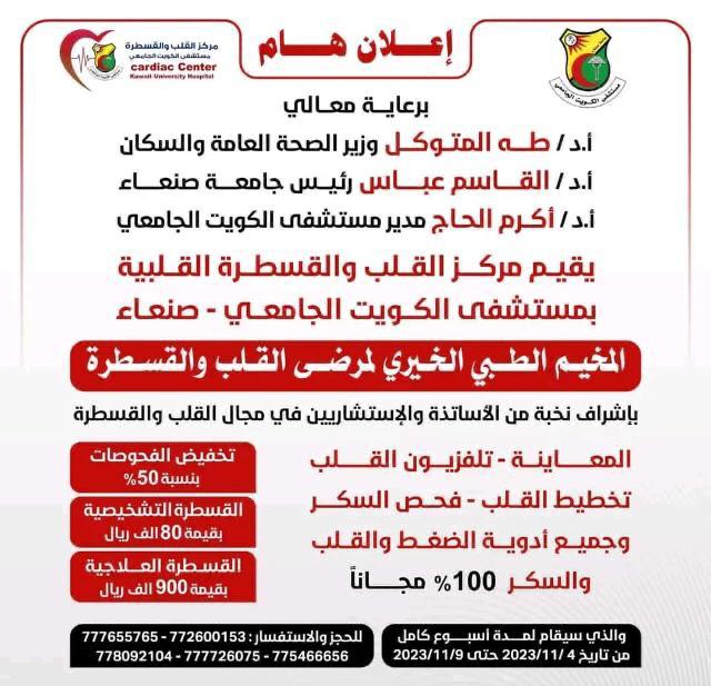 يقيم مستشفى الكويت الجامعي بصنعاء “المخيم الطبي الخيري لمرضى القلب والقسطرة”.. تحت إشراف نخبة من الأساتذة والاستشاريين في مجال القلب والقسطرة.