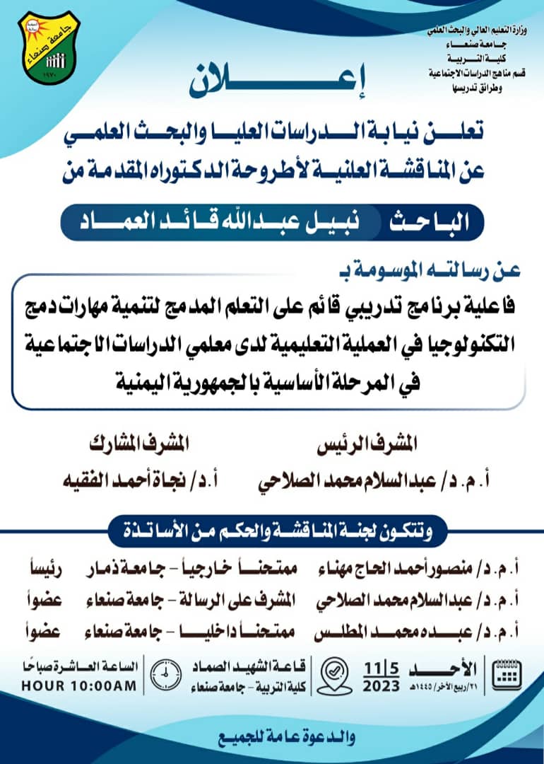 فاعلية برنامج تدريبي قائم على التعلم المدمج لتنمية مهارات دمج التكنولوجيا في العملية التعليمية لدى معلمي الدراسات الاجتماعية في المرحلة الأساسية بالجمهورية اليمنية