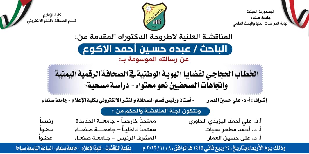 الخطاب الحجاجي لقضايا الهُوية الوطنية في الصحافة الرقمية اليمنية واتجاهات الصحفيين نحو محتواه “دراسة مسحية”.