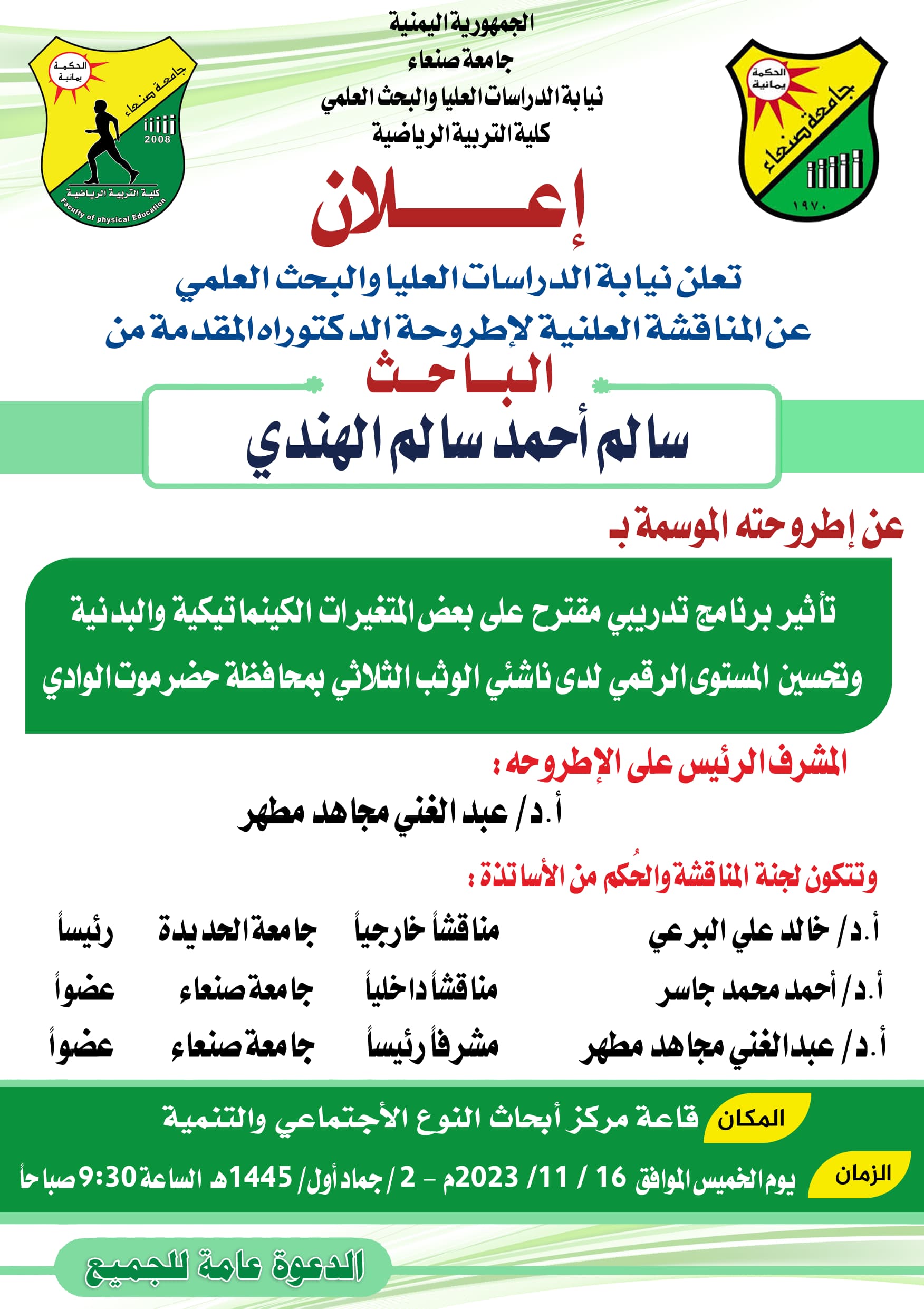 بحث علمي مقدم للحصول على درجة الدكتوراة كلية التربية الرياضية-جامعة صنعاء