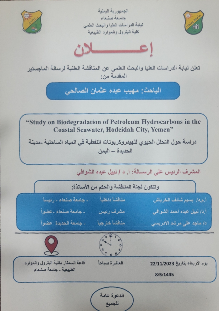 دراسة حول التحلل الحيوي للهيدروكربونات النفطية في المياة الساحلية-مدينة الحديدة-اليمن