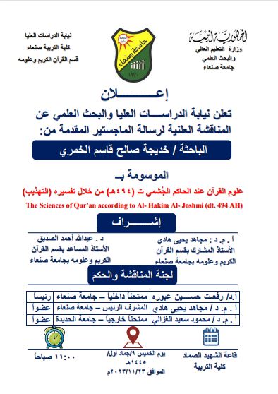 تعلن نيابة الدراسات العليا والبحث العلمي عن المناقشة العلنية لرسالة الماجستير المقدمة من :