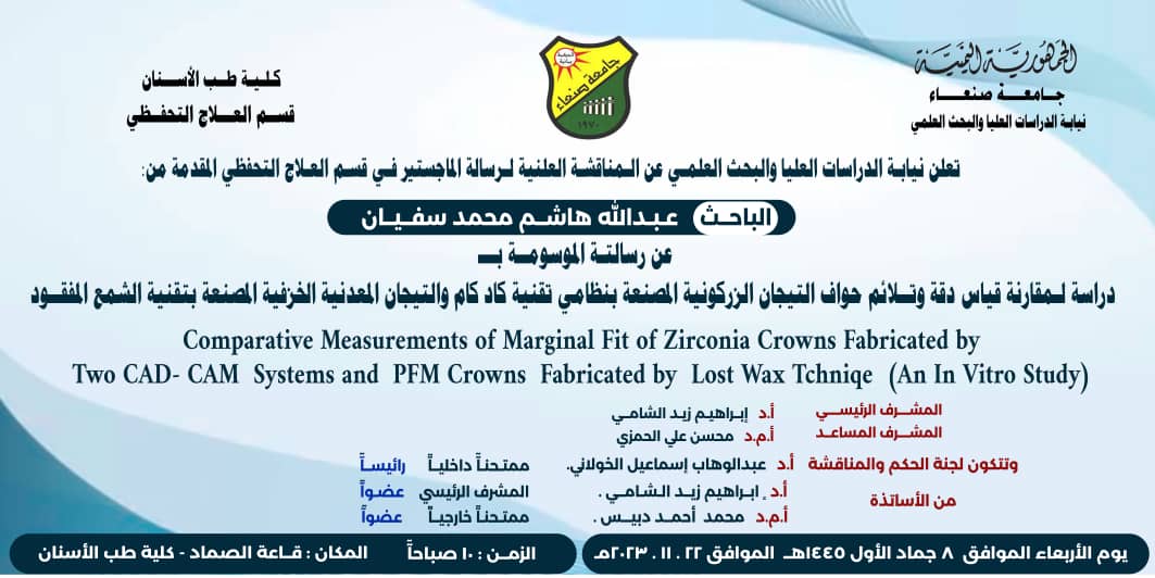 دراسة لمقارنة دقة وتلائم حواف التيجان الزركونية المصنعة بنظامي تقنية كاد كام والتيجان المعدنية الخزفية المصنعة بتقنية الشمع المفقود.