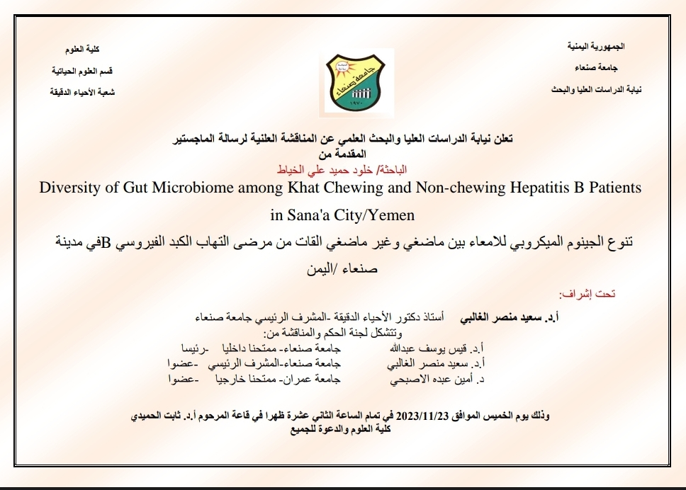 التنوع الجينوم الميكروبي للأمعاء بين ماضغي وغير ماضغي القات من مرضى التهاب الكبد الفيروسي Bفي مدينة صنعاء /اليمن