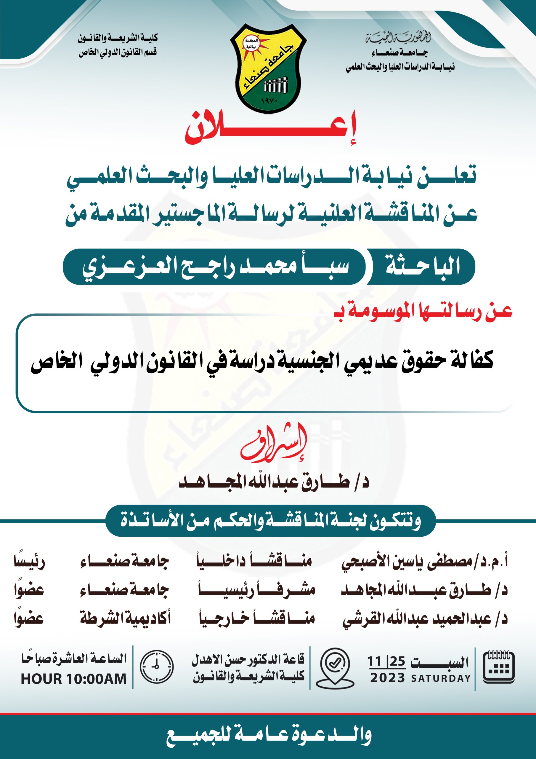 تعلن نيابة الدراسات العليا والبحث العلمي عن المناقشة العلنية لرسالة الماجستير المقدمة من :