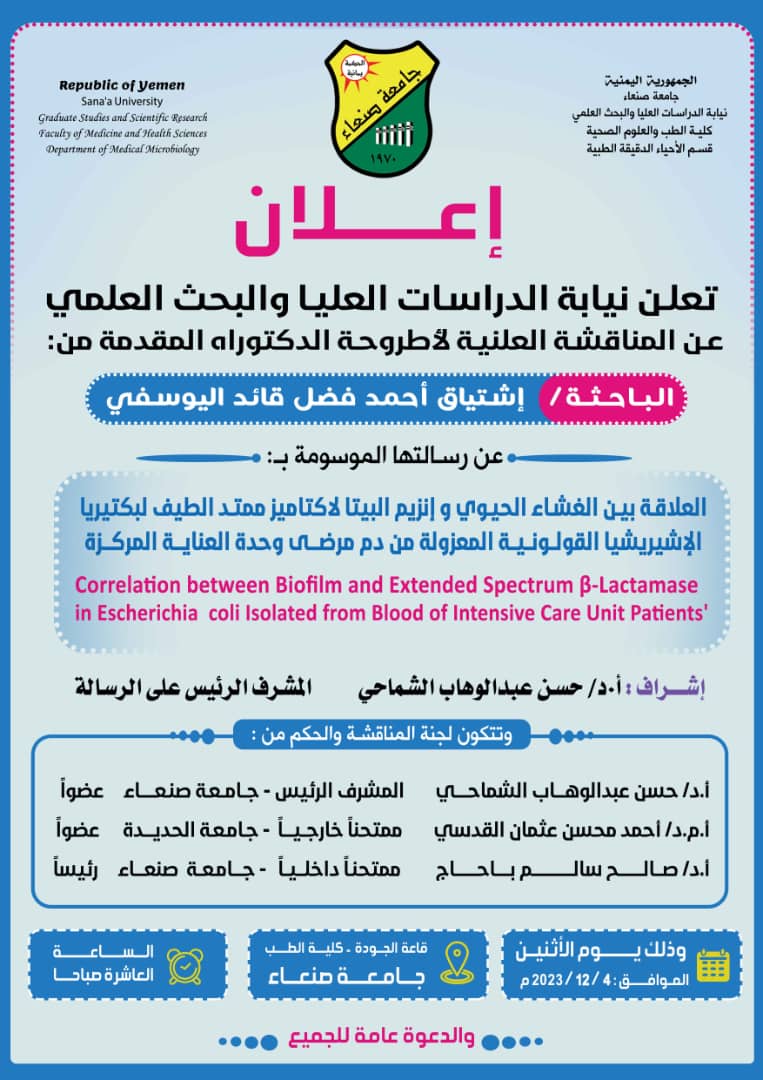 العلاقة بين الغشاء الحيوي وإنزيم البيتا لاكتاميز ممتد الطيف لبكتيريا الإشيريشيا القولونية المعزولة من دم مرضى وحدة العناية المركزة