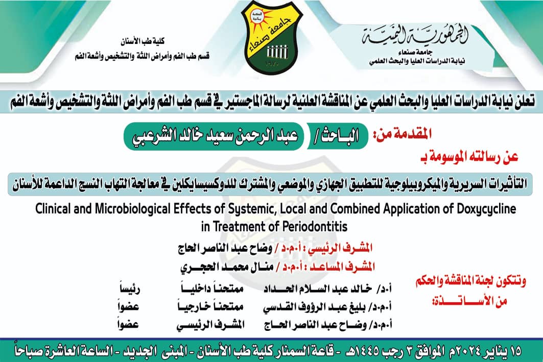 التأثيرات السريرية والميكروبيلوجية للتطبيق الجهازي والموضعي والمشترك للدوكسيسايكلين في معالجة التهاب النسج الداعمة للأسنان