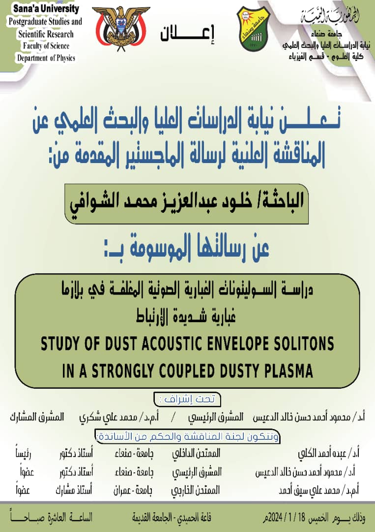 تعلن نيابة الدراسات العليا والبحث العلمي عن المناقشة العلنية لرسالة الماجستير المقدمة من :