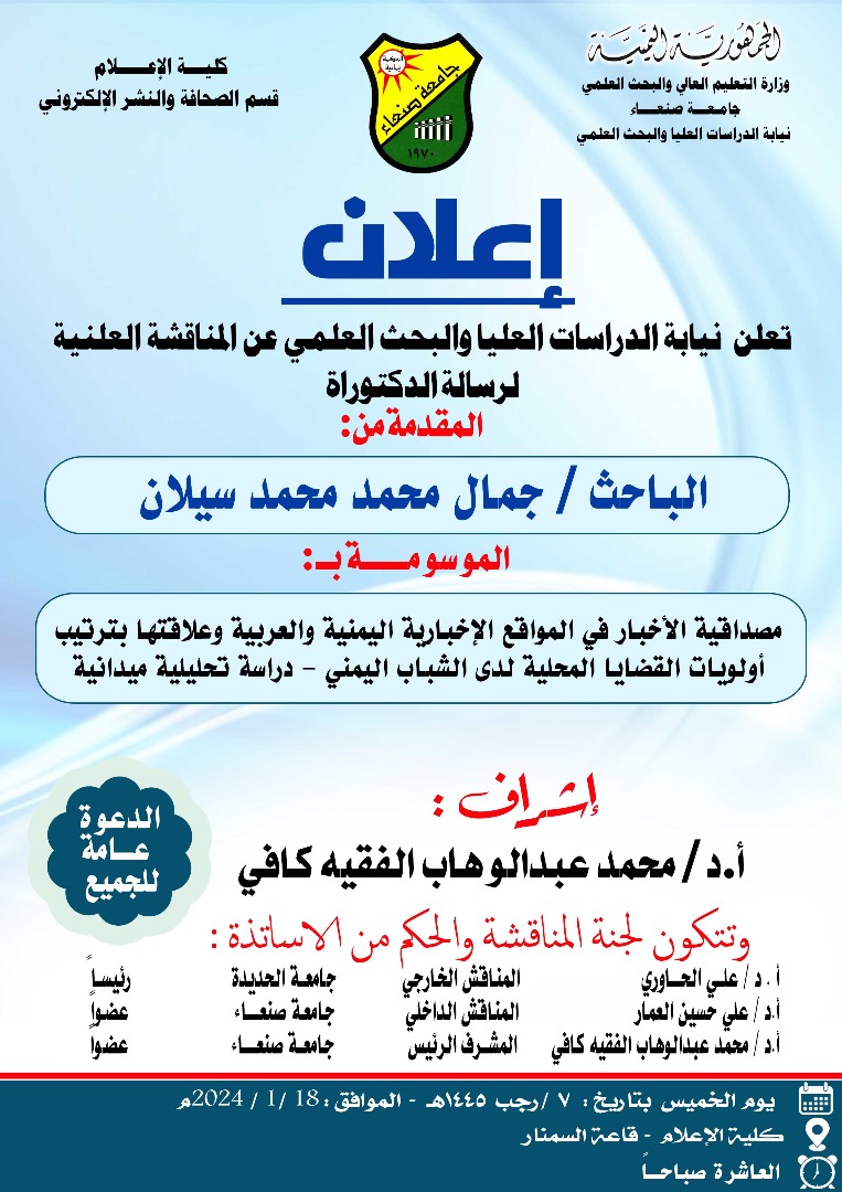 مصداقية الأخبار في المواقع الإخبارية اليمنية والعربية وعلاقتها بترتيب اولويات القضايا المحلية لدى الشباب اليمني-دراسة تحليلية ميدانية