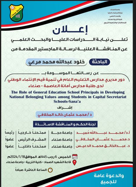 دور مديري مدراس التعليم العام في تنمية قيم الإنتماء الوطني لدى طلبة مدارس أمانة العاصمة-صنعاء