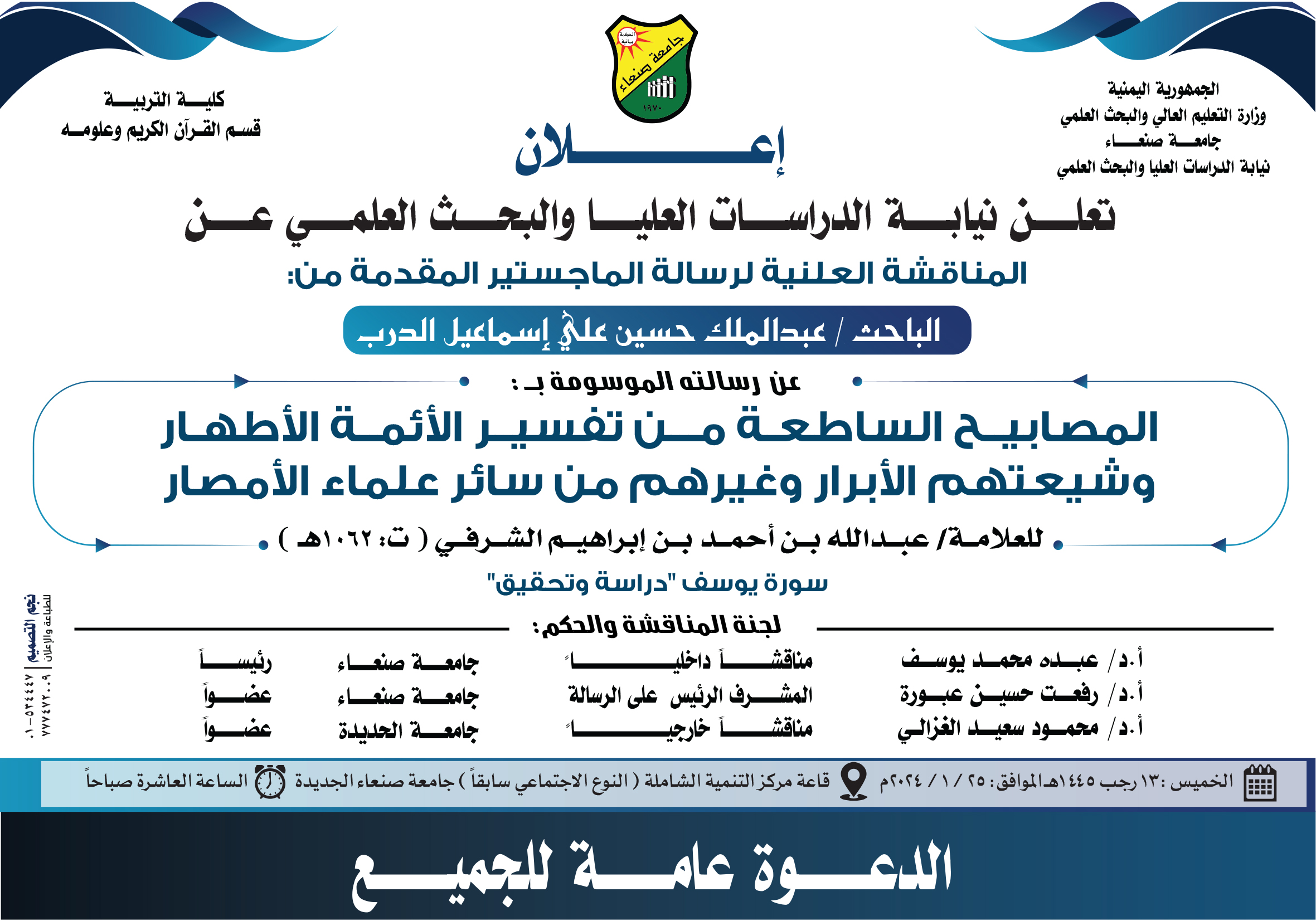 تعلن نيابة الدراسات العليا والبحث العلمي عن المناقشة العلنية لرسالة الماجستير المقدمة من :