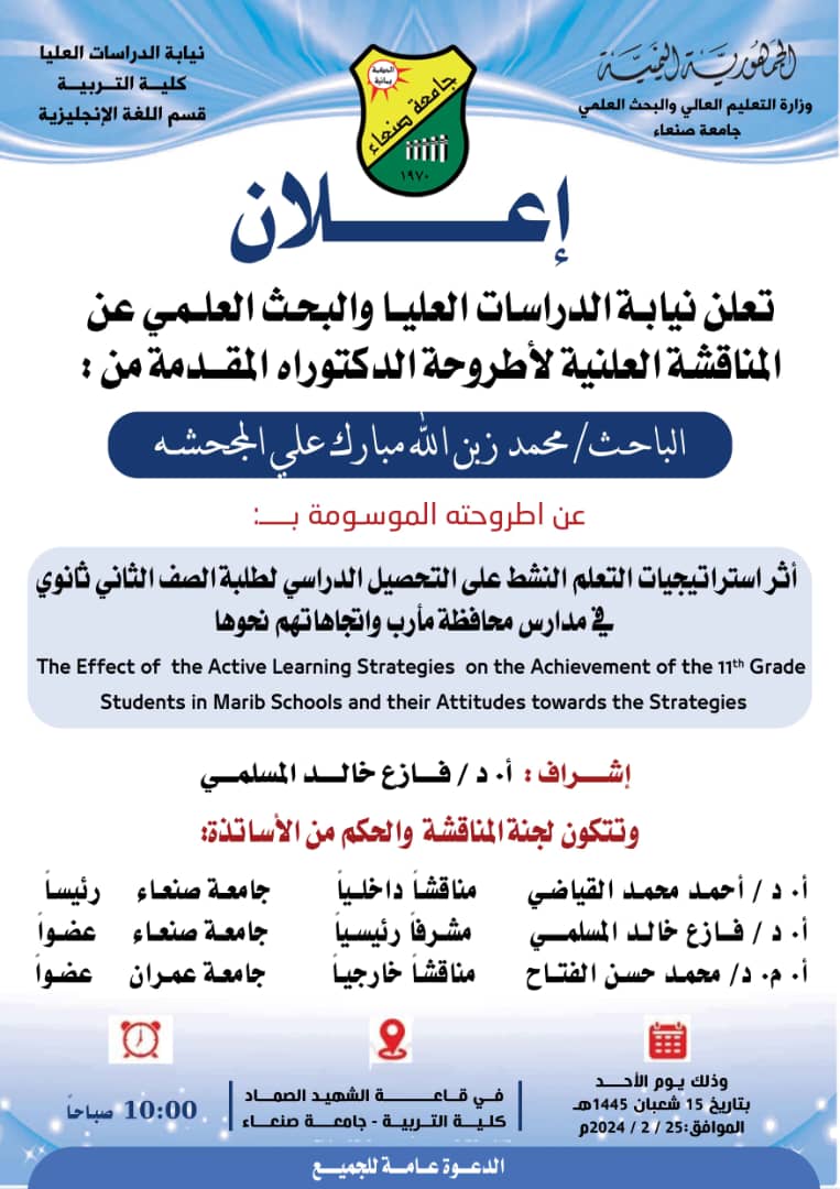 The Effect of the Active Learning Strategies on the Achievement of the 11th Grade Students in Marib Schools and their Attitudes towards the Strategies