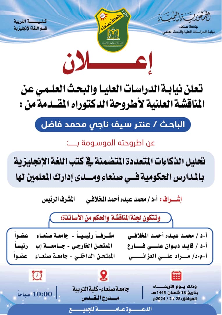 تحليل الذكاءات المتعددة المتضمنة في كتب اللغة الانجليزية بالمدارس الحكومية في صنعاء ومدى إدراك المعلمين لها