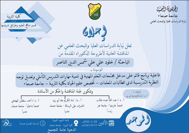 تعلن نيابة الدراسات العليا والبحث العلمي عن المناقشة العلنية لاطروحة الدكتوراة المقدمة من :