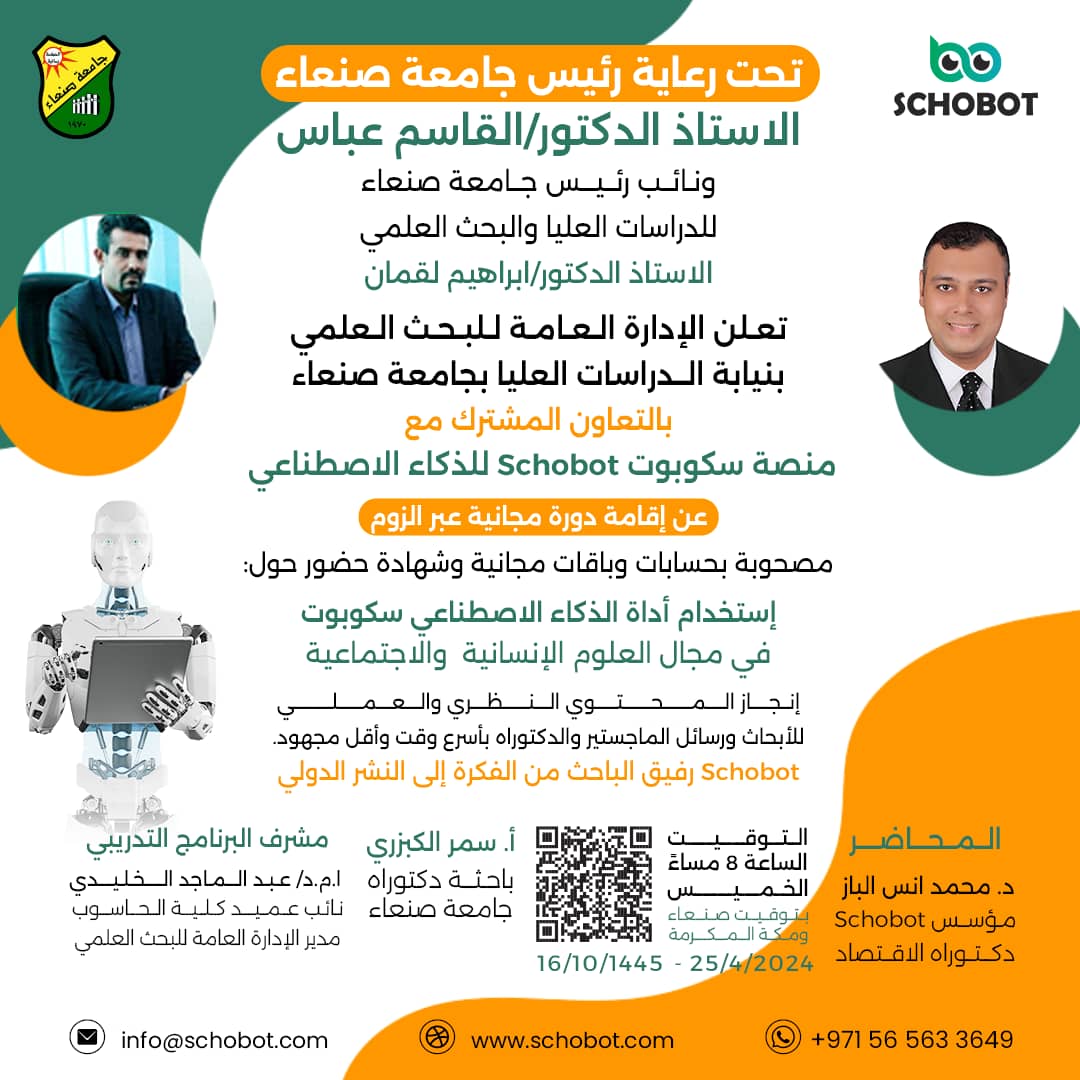 تعلن الإدارة العامة للبحث العلمي بنيابة الدراسات العليا بجامعة صنعاء بالتعاون المشترك مع منصة سكوبوت Schobot للذكاء الاصطناعي
