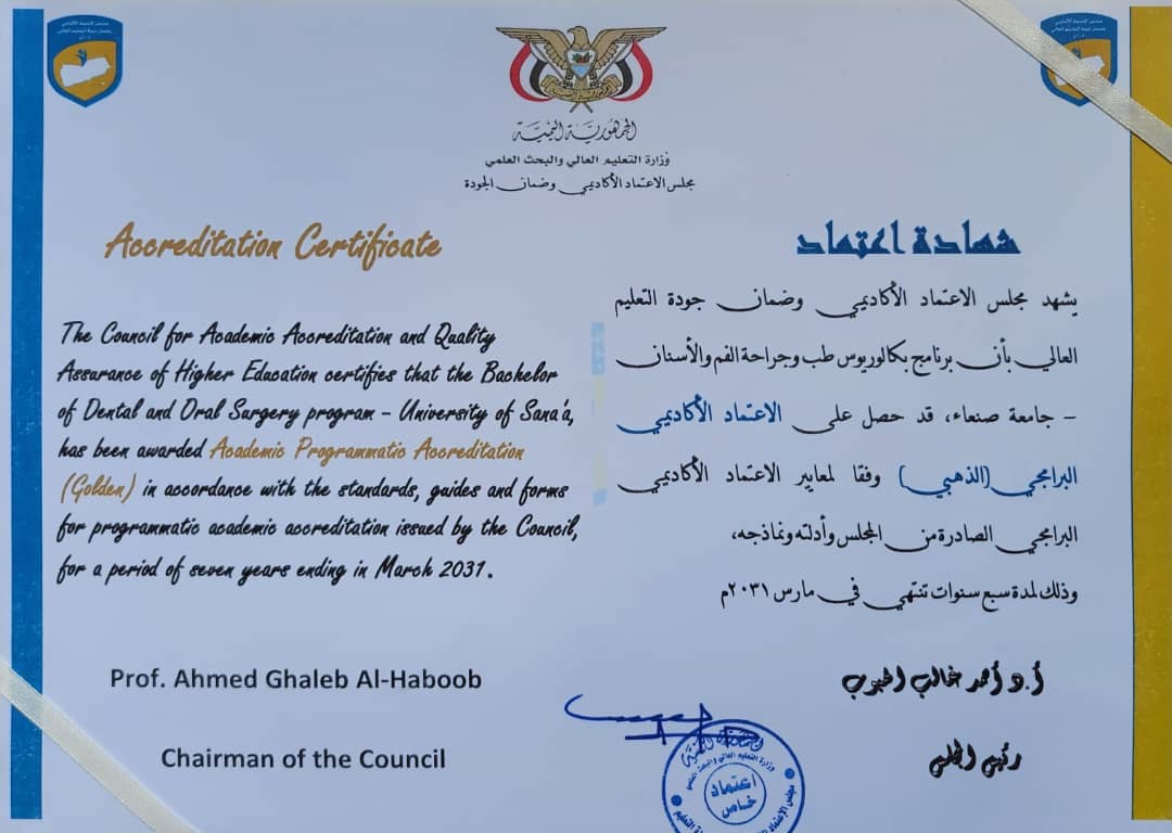 كلية طب الأسنان بجامعة صنعاء اول كلية يمنية تحصل على الاعتماد الوطني الأكاديمي وضمان جودة التعليم العالي في برنامج جراحة الفم والأسنان