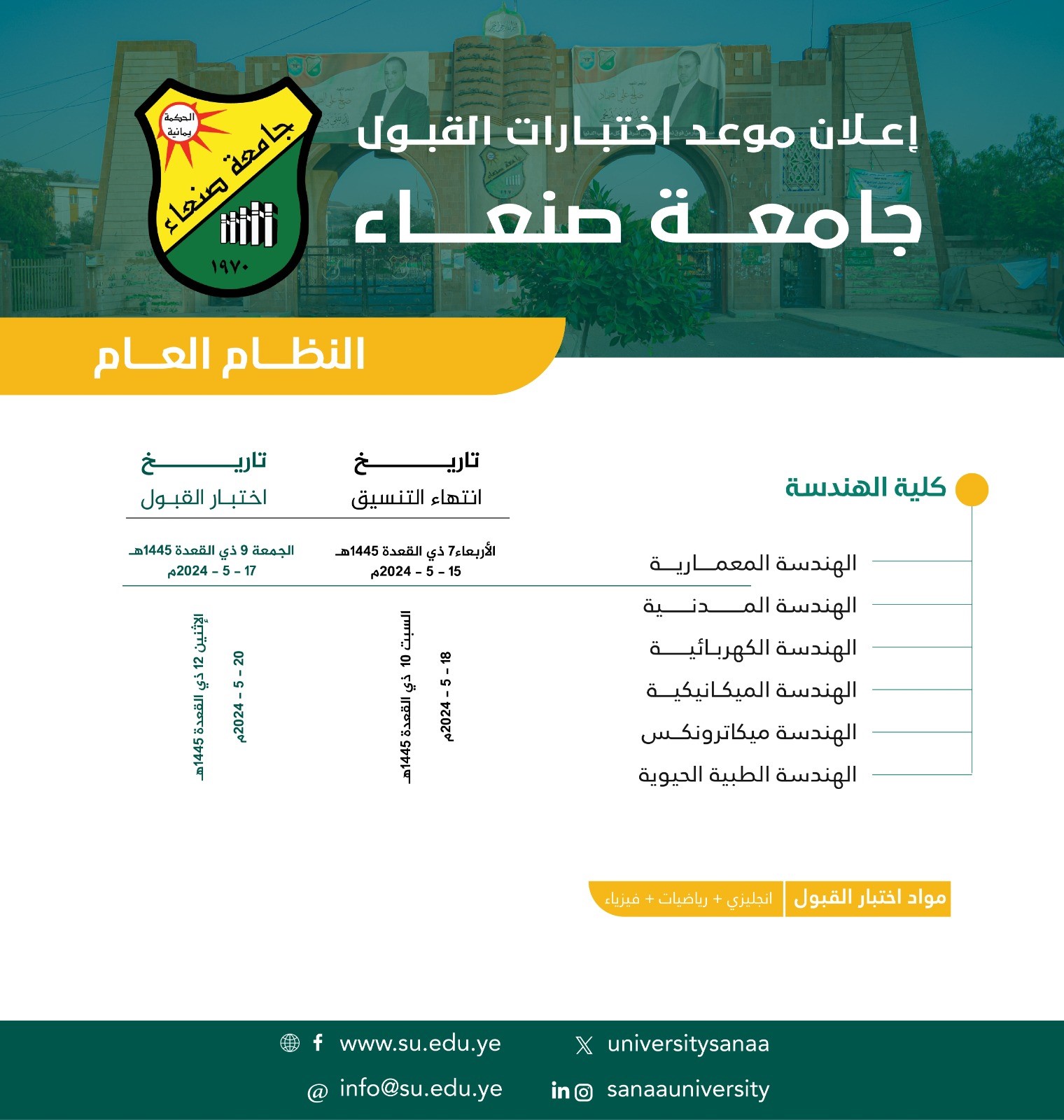 تعلن نيابة رئاسة جامعة صنعاء لشؤون الطلاب أن إختبار القبول لقسم الهندسة المعمارية النظام العام سيكون يوم الجمعه الموافق 17 مايو 2024 فيما تم تاجيل الاختبار لبقية التخصصات الي يوم الأثنين 20 مايو الجاري للنظام العام.