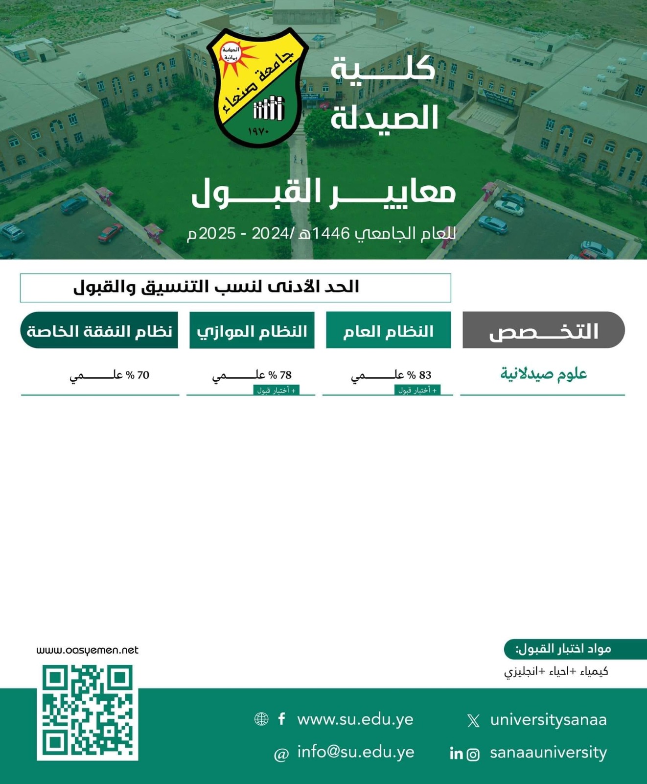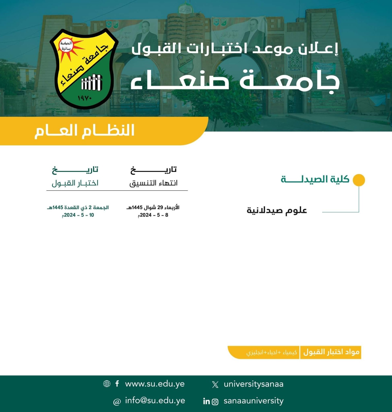 تعلن جامعة صنعاء لأبنائها الطلاب والطالبات المتقدمين للتنسيق والقبول في كليتي الصيدلة و طب الأسنان أن التنسيق في البوابة الإلكترونية للكليتين في النظام العام سيغلق تمام الساعة الثانية عشرة منتصف ليلة غداً الأربعاء 8 مايو كما سيتم إغلاق حوافظ التسديد للتنسيق في الكليتين( الصيدلة وطب الاسنان ) النظام العام يوم بعد غدا الخميس الساعة الرابعة عصرا وسيتم إعلان أسماء الطلاب الذين تم تنسيقهم وتم التسديد لحوافظ التنسيق ويحق لهم دخول اختبارات القبول في كليتي الصيدلة وطب الاسنان في النظام العام في موقع جامعة صنعاء وصفحاتها في مواقع التواصل الاجتماعي في فترة ما بعد المغرب بعد غدا الخميس علما أن الاختبار سيكون في مركز الاختبار الإلكتروني الموجود بكلية طب الاسنان في منطقة مذبح يوم الجمعة القادم والله ولي التوفيق.