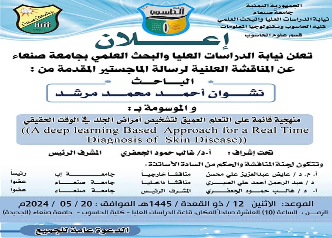 تعلن نيابة الدراسات العليا والبحث العلمي عن المناقشة العلنية لرسالة الماجستير المقدمة من :
