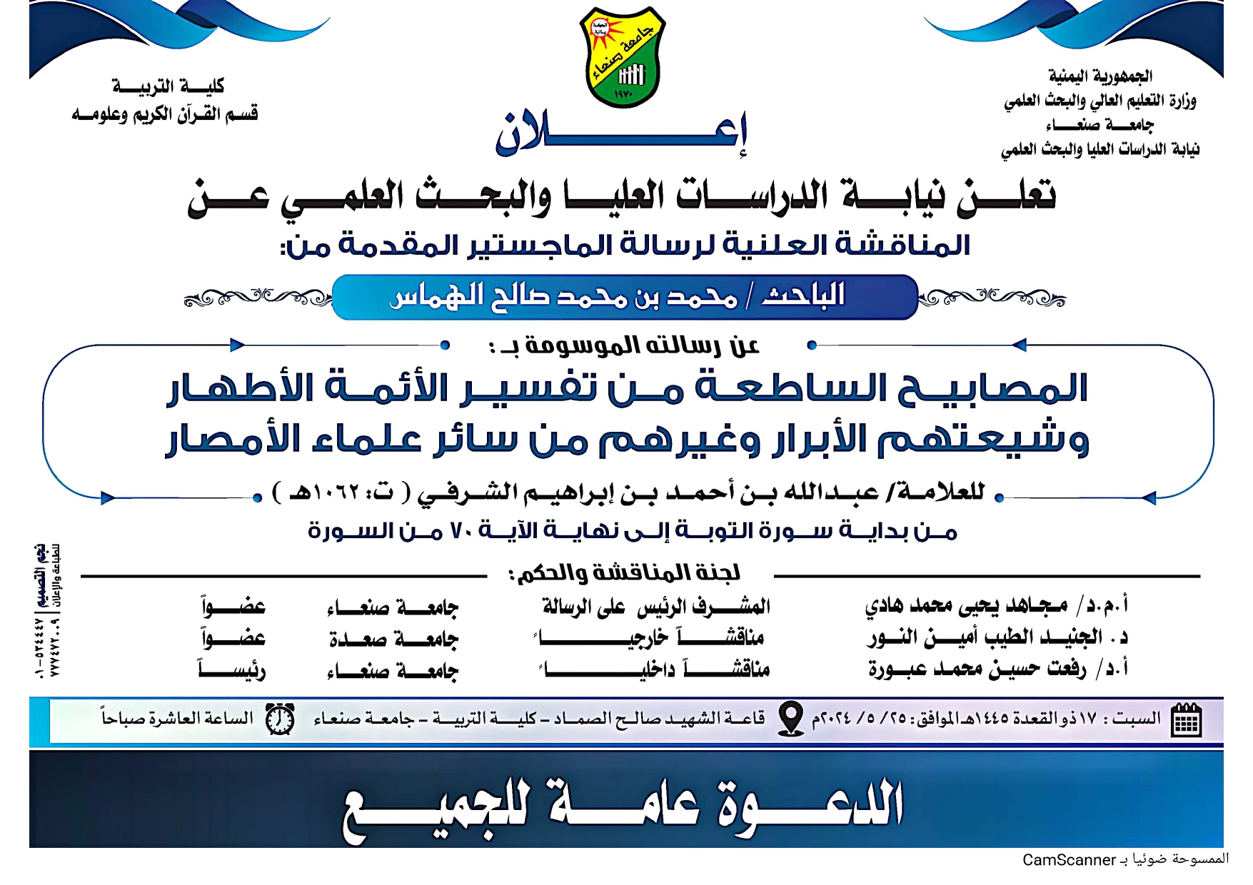 تعلن نيابة الدراسات العليا والبحث العلمي عن المناقشة العلنية لرسالة الماجستير المقدمة من :