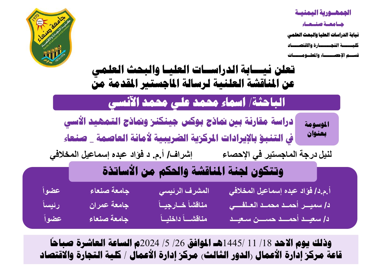 دراسة مقارنة بين نماذج بوكس جينكنز ونماذج التمهيد الأسي في التنبؤ بالإيرادات المركزية الضريبية لأمانة العاصمة _ صنعاء