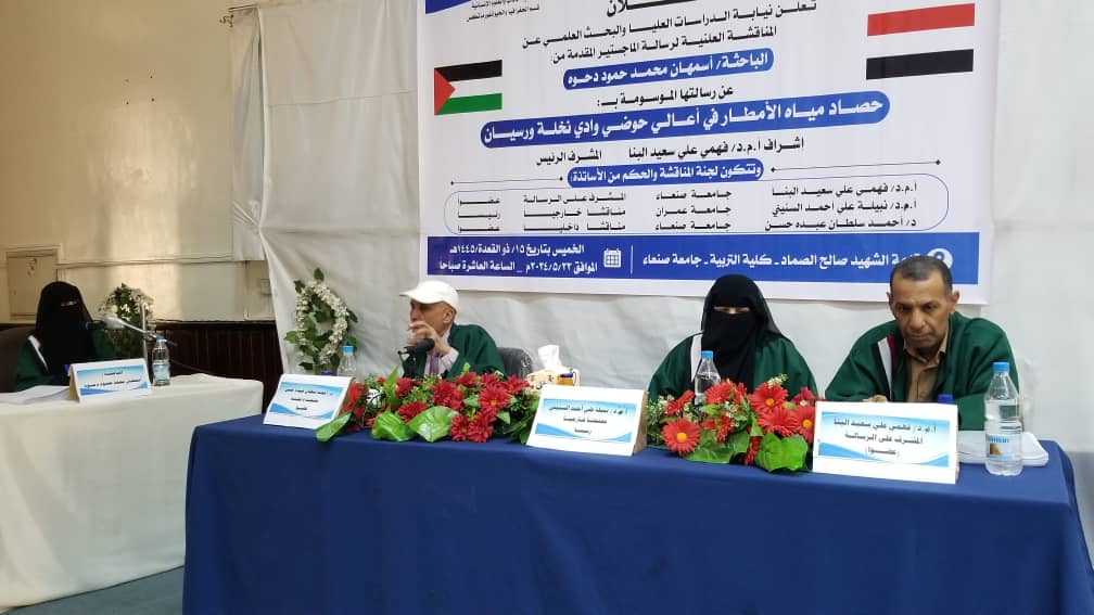 تمت يوم الخميس 15 ذي القعدة1445هـ الموافق 23 مايو 2024 م مناقشة البحث المقدم من الطالبة: اسمهان محمد حمود دحوه، والموسوم بـ: حصاد مياه الأمطار في أعالي حوضي وادي نخلة ورسيان، وذلك استكمالاً لمتطلبات الحصول على درجة الماجستير في الجغرافيا والجيوانفورماتكس .