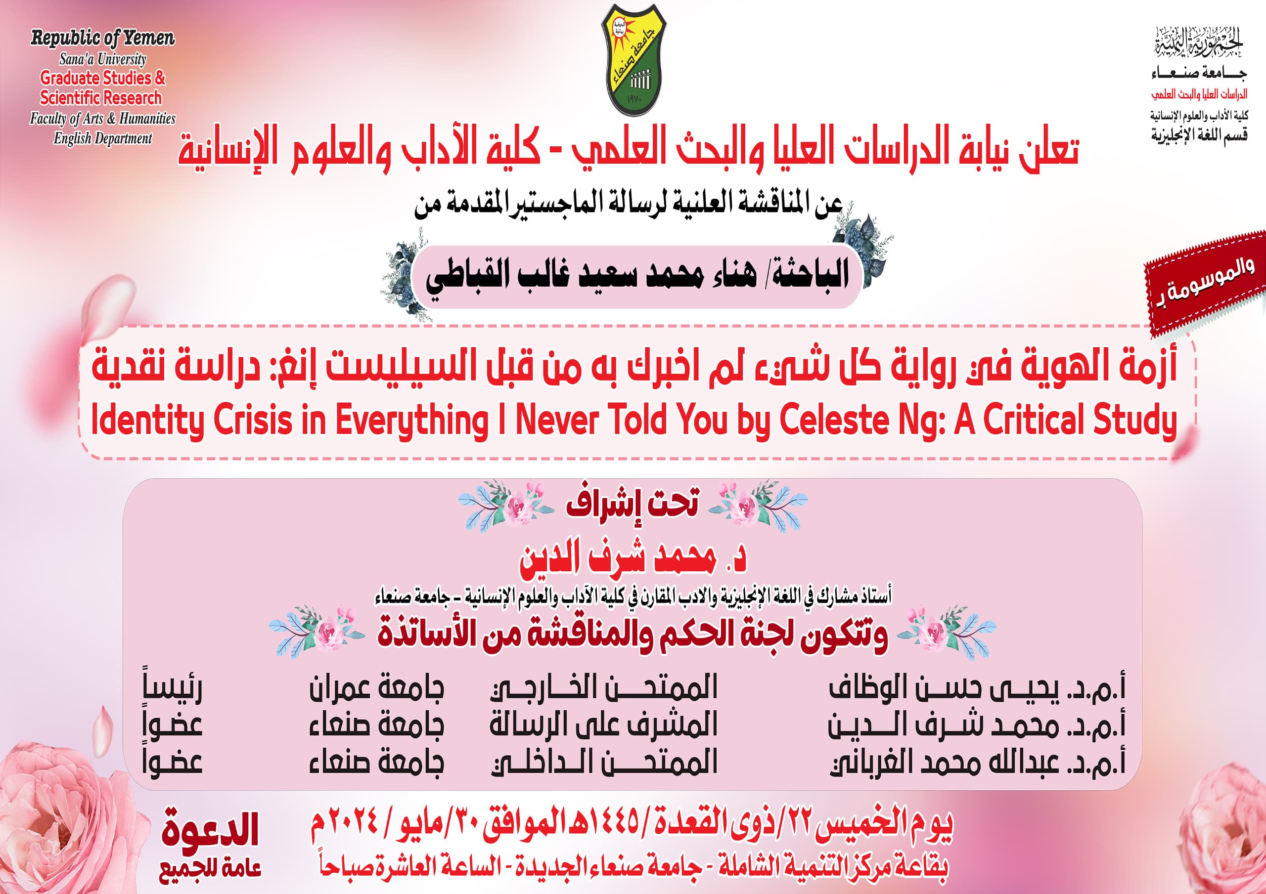 تعلن نيابة الدراسات العليا والبحث العلمي عن المناقشة العلنية لرسالة الماجستير المقدمة من :