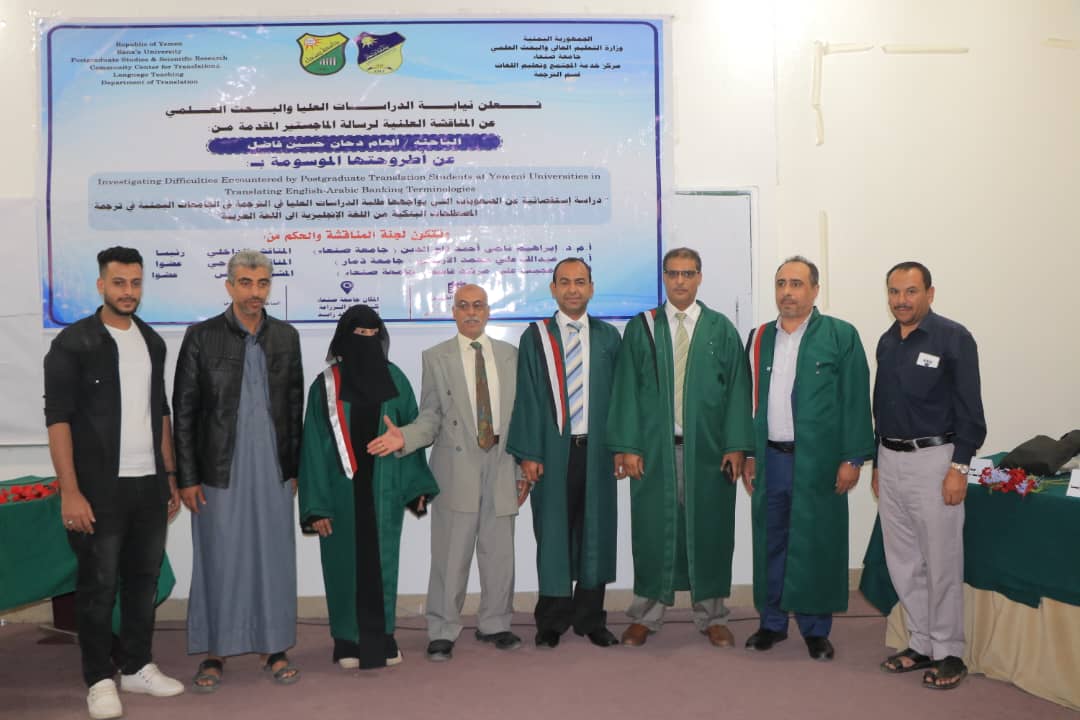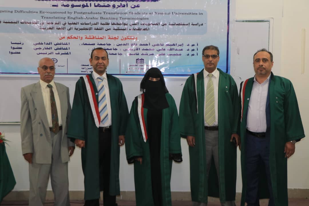 اتمام مناقشة البحث الموسوم بـ: دراسة استقصائية عن الصعوبات التي يواجهها طلبة الدراسات العليا في الترجمة في الجامعات اليمنية في ترجمة المصطلحات البنكية من اللغة الإنجليزية إلى اللغة العربية