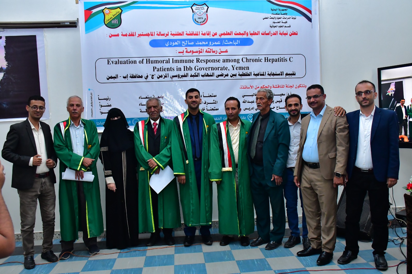 أمس السبت بتاريخ 24 ذو القعدة 1445هـ الموافق 1 يونيو 2024م، نوقشت في كلية العلوم، قسم العلوم الحياتية، رسالة الماجستير المقدمة من الباحث عمرو محمد صالح العودي بعنوان “تقييم الاستجابة المناعية الخلطية بين مرضى التهاب الكبد الفيروسي المزمن النمط ‘ج’ في محافظة إب – اليمن” (Evaluation of Humoral Immune Response among Chronic Hepatitis C Patients in Ibb Governorate, Yemen).