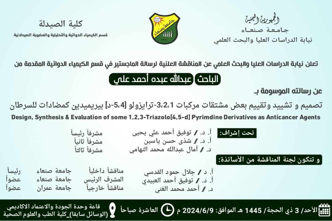 تعلن نيابة الدراسات العليا والبحث العلمي عن المناقشة العلنية لرسالة الماجستير المقدمة من الباحث: :