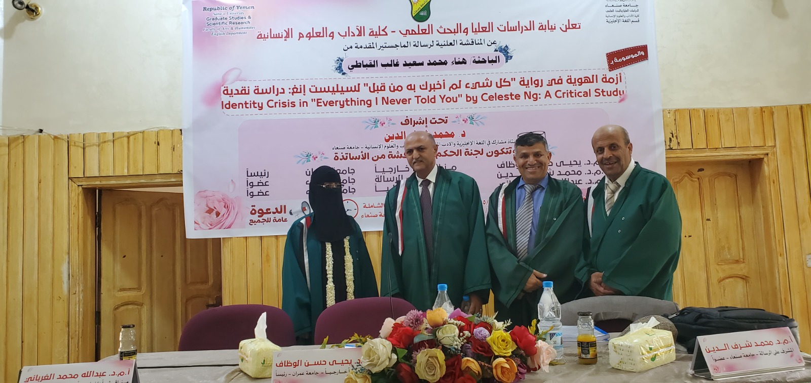 نالت الباحثة/ هناء محمد سعيد غالب القباطي درجة الماجستير في الادب الامريكي بدرجة امتياز من كلية الآداب والعلوم الإنسانية بجامعة صنعاء عن رسالتها الموسومة ب (أزمة الهوية في رواية “كل شيئ لم اخبرك به من قبل” للكاتبة سيليست انغ : دارسة نقدية ، وقد تكونت لجنة المناقشة والحكم من الاستاذ الدكتور ا.م.د. /محمد احمد شرف الدين المشرف الرئيس عضوا،