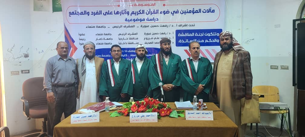 نال الباحث/ خالد محمد عوض هران درجة الماجستير في كلية التربية- تخصص قران كريم وعلومه بتقدير ممتاز ودرجة 95% من جامعة صنعاء عن رسالة الموسومة بـ مآلات المؤمنين في ضوء القران الكريم وآثارها على الفرد والمجتمع.