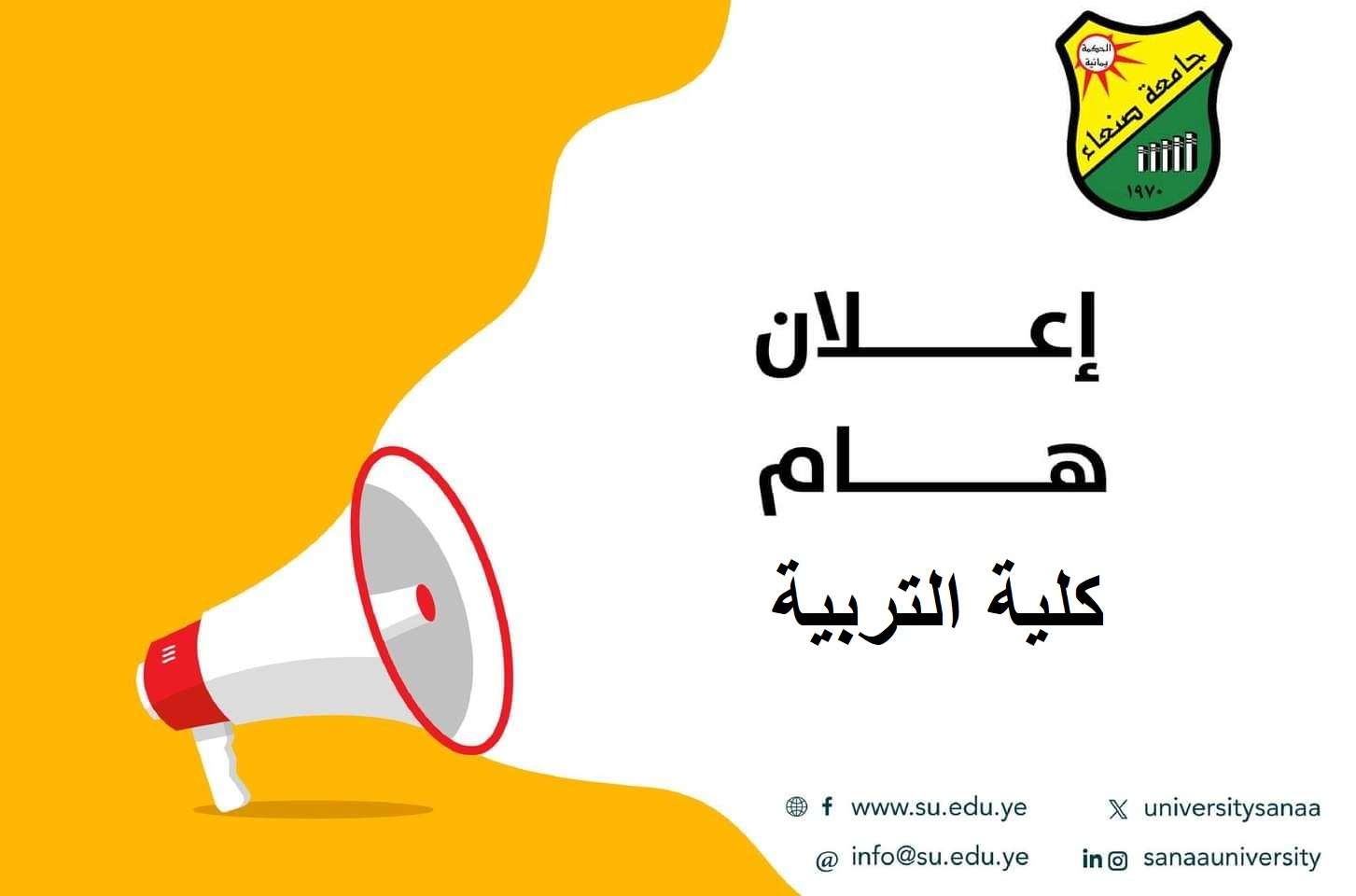 إعلان هام.. لأبنائنا الطلاب وبناتنا الطالبات المنسقين والمسددين رسوم التنسيق في كلية التربية صنعاء