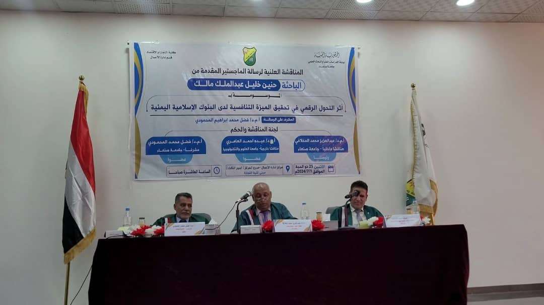نالت الباحثة: حنين خليل عبدالملك مالك درجة الماجستير – كلية التجارة الإقتصاد- جامعة صنعاء قسم إدارة الأعمال بدرجة 95% عن رسالتها الموسومة بــ: (أثر التحول الرقمي في تحقيق الميزة التنافسية لدى البنوك الإسلامية اليمنية).