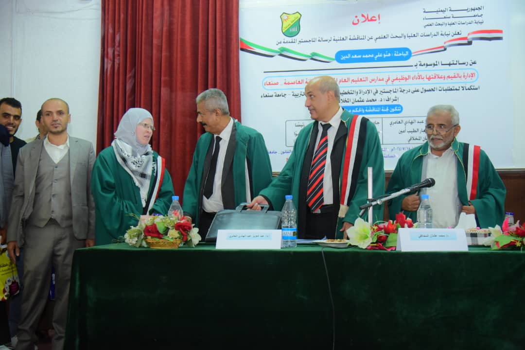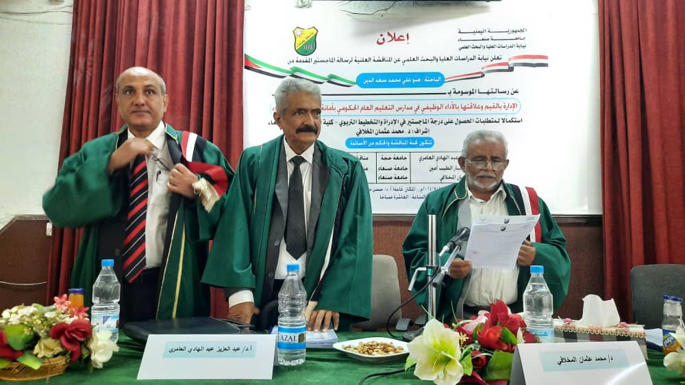 نالت الباحثة: هنّو علي محمد سعد الدين درجة الماجستير في الإدارة والتخطيط التربوي تخصص إدارة وتخطيط تربوي بدرجة امتياز مع توصية لجنة المناقشة والحكم بطباعة الرسالة على نفقة الجامعة وتبادلها بين المناطق التعليمية عن رسالتها الموسومة بــ: (الإدارة بالقيم وعلاقتها بالأداء الوظيفي في مدارس التعليم العام الحكومي بأمانة العاصمة _ صنعاء).
