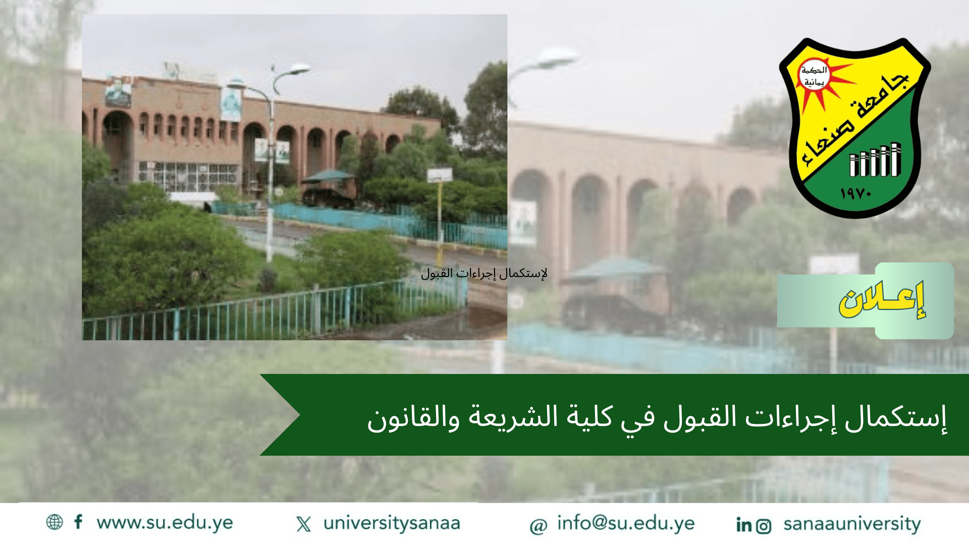 تعلن نيابة رئاسة الجامعة لشؤون الطلاب بجامعة صنعاء لجميع الطلاب والطالبات المنسقين والمسددين لرسوم التنسيق بكلية الشريعة والقانون – النظام الموازي( الطلاب الذين لم يستكملوا قبولهم بحسب كشوفات القبول المرفقة في الرابط ادناه ) أن عليهم التوجه لإستكمال إجراءات القبول يومي السبت/الاحد الموافق 27_28/يوليو 2024 الجاري في مبنى الكلية بالجامعة الجديدة الفترة الصباحية وعلى الطالب الحضور بنفسه مع اصطحاب الاتي:
